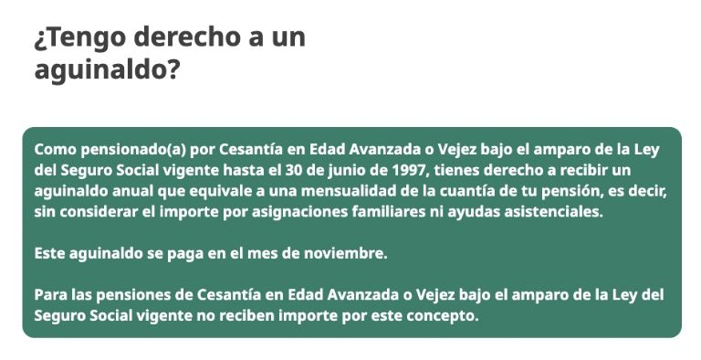 Las personas pensionadas por Cesantía en Edad Avanzada o Vejez bajo el amparo de la Ley del Seguro Social vigente hasta el 30 de junio de 1997 tienen derecho a recibir un aguinaldo anual, lo que corresponde a una mensualidad del monto de la pensión, sin incluir los importes por asignaciones familiares ni ayudas asistenciales.