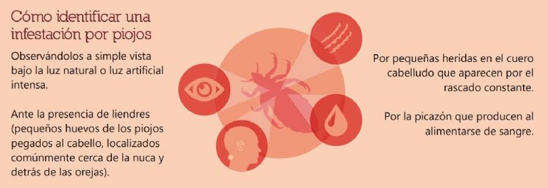 El instituto explica que la infestación se identifica a simple vista, bajo la luz natural o luz artificial intensa, principalmente en las heridas del cuero cabelludo. Es importante evitar el rascado, toda vez que se alimentan de la sangre, mientras que la presencia de liendres también es un signo de infestación de piojos, y frecuentemente pegan sus huevos al cabello, localizados comúnmente en la nuca o detrás de las orejas.