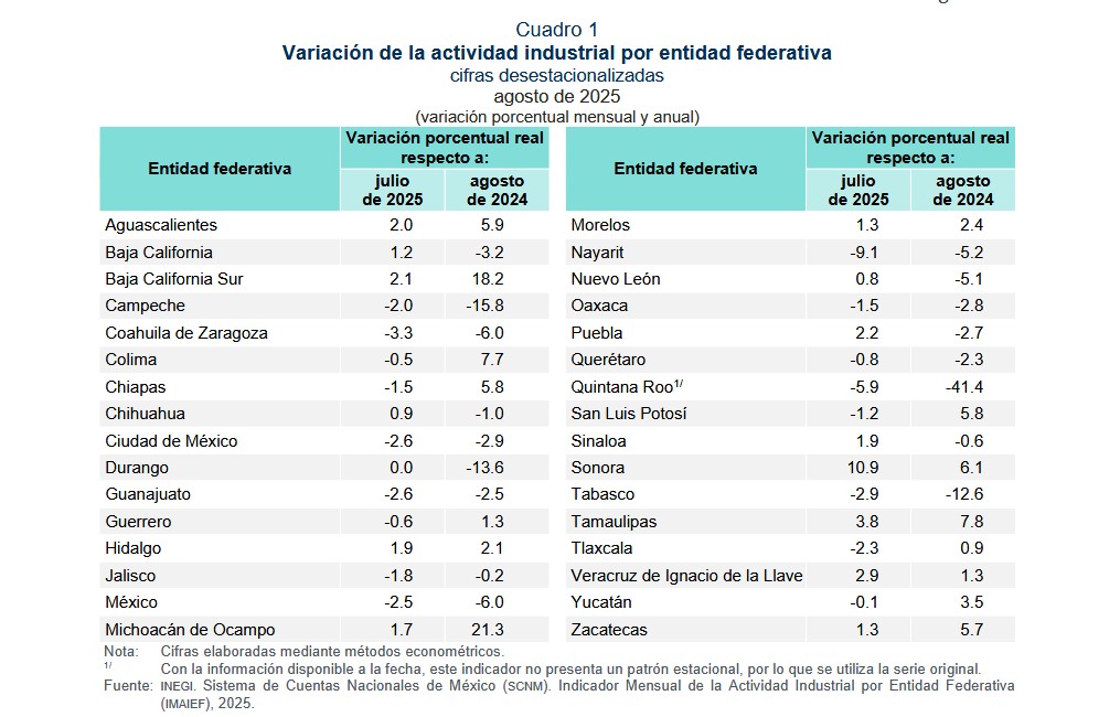 Aunque el boletín del INEGI destaca los avances en estados del norte y en entidades con fuerte impulso industrial, también señala que varios estados del sur del país se fueron a la baja en producción durante agosto de 2025.