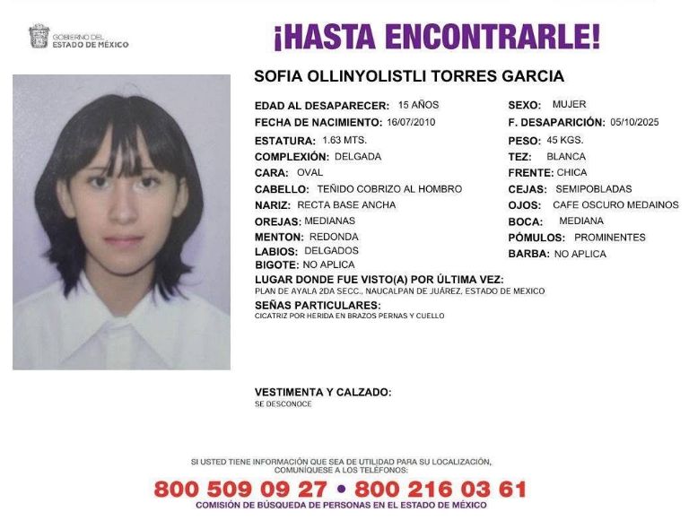 Ahora, en medio de las protestas para exigir la localización de Kimberly, vecinos de Naucalpan han evidenciado la desaparición de otra adolescente, quien se extravió en la misma zona donde fue vista por última vez la estudiante de la UNAM. Se trata de Sofía Ollinyolistli Torres García, de 15 años de edad, quien fue reportada como desaparecida desde el pasado 5 de octubre, solo tres días después de que Kimberly no regresó a su casa tras salir a sacar copias.