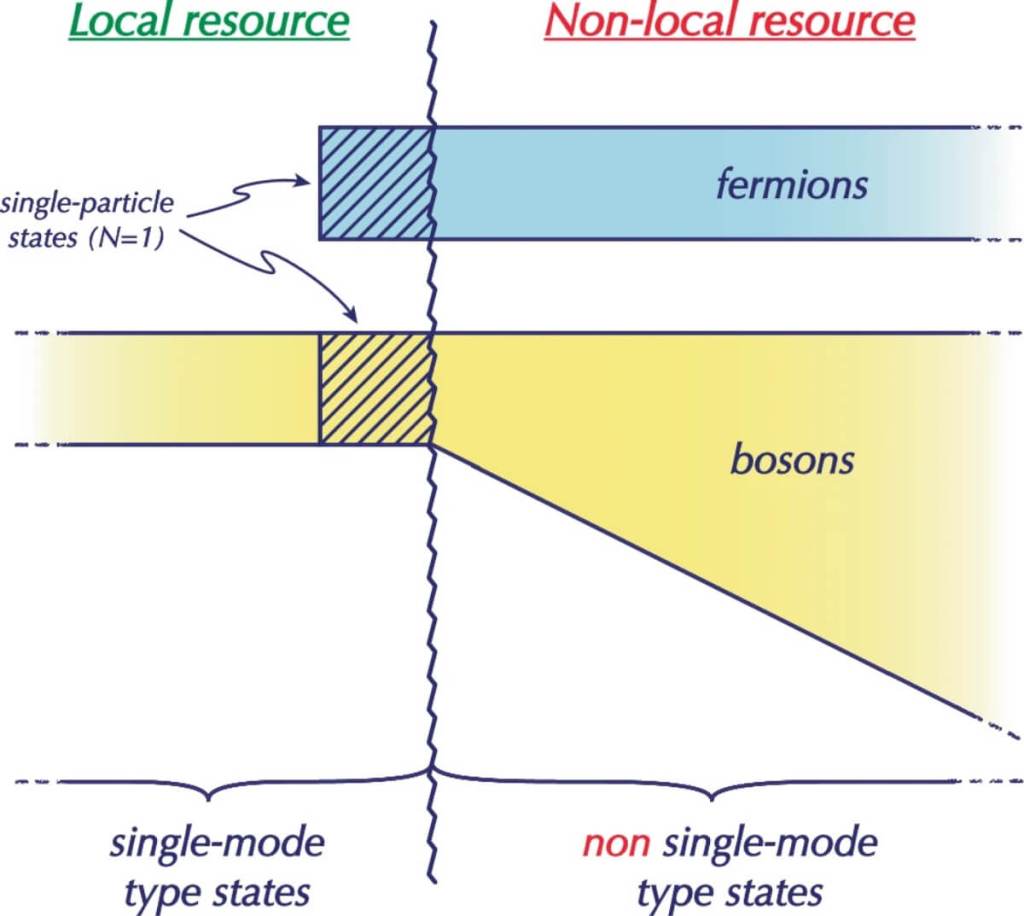 Esto tiene consecuencias importantes: todos los estados fermiónicos con más de una partícula se comportan como recursos no locales, ya que el principio de exclusión de Pauli impide que estén en el mismo modo. En cambio, algunos estados bosónicos sí pueden ser locales si son reducibles a un solo modo, aunque se trata de una clase estrecha de excepciones.