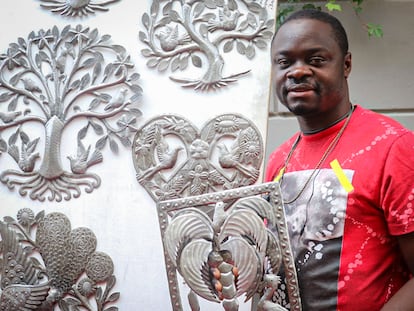 Otro de los migrantes haitianos que llegó a Chile en 2017 es Joubert Brutus. A las nueve de la mañana, acaba de instalar su puesto de artesanías de metal en el mercado callejero de Lastarria, en el centro de Santiago. A la vez que cuelga las brillantes y pulidas piezas, relata sus inicios en este país: “Los primeros meses fueron muy difíciles, no tenía trabajo, mi primo regresó a Haití porque no tenía esperanzas. Yo me quedé. Trabajé en construcción hasta que pensé que podría vender las artesanías que yo hago, y que aprendí de mi papá. Me fui al metro a vender, y me fue bien.”