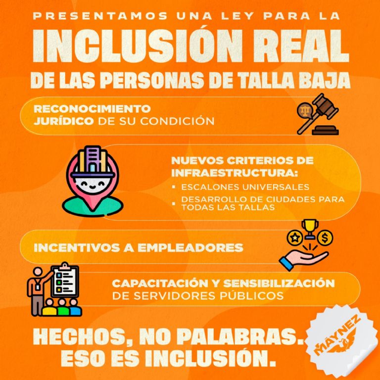 Cabe destacar que en su propuesta de Ley para la Inclusión Real de las Personas de Talla Baja del partido también se tiene propuestas como escalones universales, incentivos a empleadores.