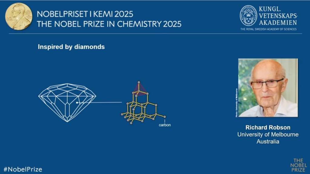 El Premio Nobel de Química 2025 ha sido otorgado a Susumu Kitagawa, Richard Robson y Omar M. Yaghi por el desarrollo de los marcos metalorgánicos (metal-organic frameworks, o MOF), una familia de materiales revolucionarios con aplicaciones en energía, medioambiente y almacenamiento molecular.