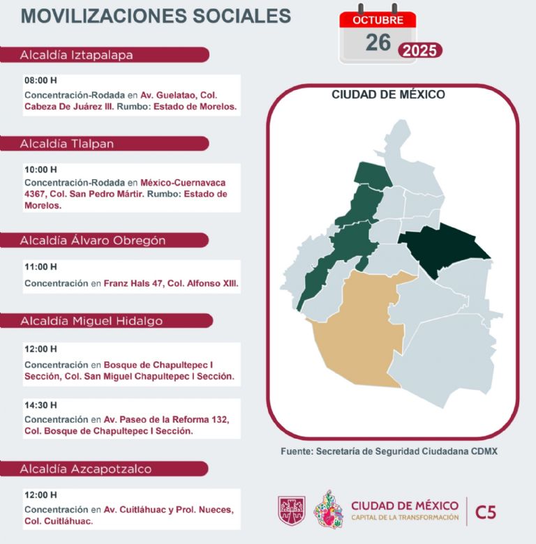 Marchas y movilizaciones este 26 de octubre | X: c5_cdmx