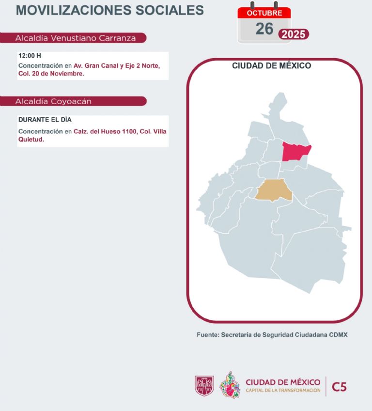 De acuerdo con la información presentada por el C5 de la Ciudad de México para este 26 de octubre se presentarán cerca de 20 movilizaciones en diferentes puntos de la capital de la República Mexicana. Las alcaldías Cuauhtémoc, Iztapalapa, Tlalpan, Álvaro Obregón, Miguel Hidalgo, Azcapotzalco, Venustiano Carranza y Coyoacán vivirán marchas, bloqueos y actividades sociales en diferentes puntos por lo que los ciudadanos capitalinos deberán estar pendientes para evitar encontrarse con vialidades cerradas.