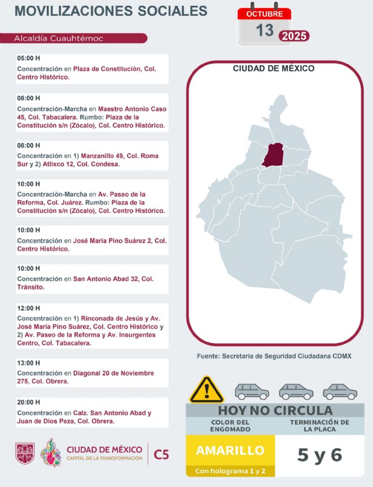 Para este lunes 13 de octubre, las marchas, movilizaciones y bloqueos registrados en la CDMX son los siguientes: