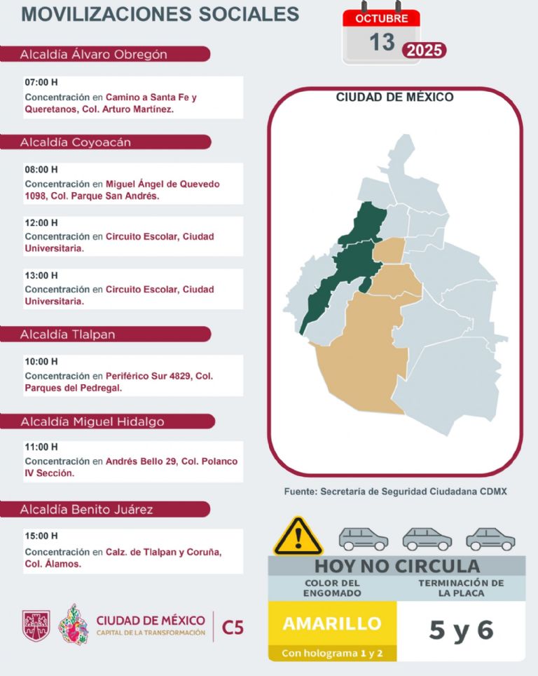 Para que tomes tus precauciones, es necesario que tomes en cuenta la agenda difundida por el Centro de Comando, Control, Cómputo, Comunicaciones y Contacto Ciudadano de la Ciudad de México (C5), y así sepas cuáles serán las vialidades afectadas y tomes tus alternativas viales o de transporte, en caso de que tu ruta se vea alterada por alguna de estas concentraciones.
