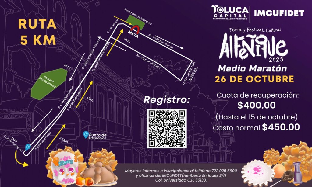 Prepara tus tenis para el Medio Maratón 2025 en el Edomex, competencia que forma parte de las actividades de la Feria del Alfeñique en Toluca y que se ha convertido en uno de los eventos más esperados de esta temporada de Día de Muertos.