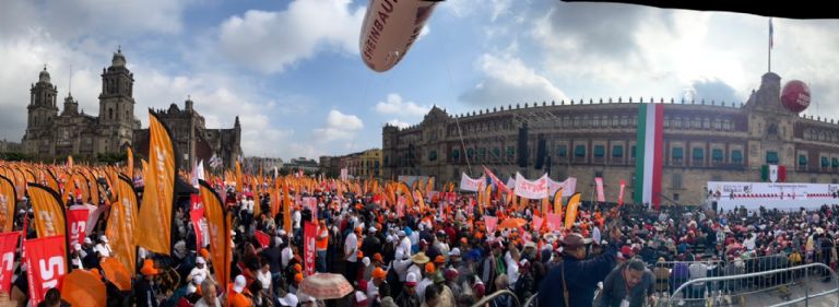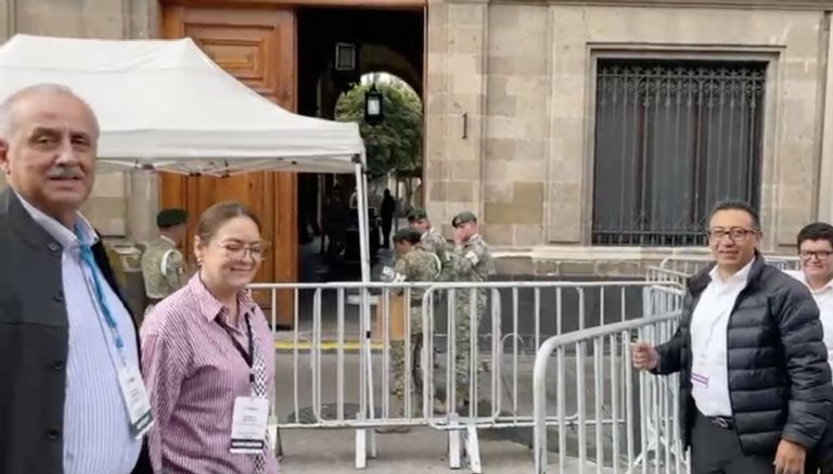En las calles aledañas solo se permite el paso peatonal. Caminan con mantas y gorras del partido “Morena”. Algunos visten chalecos con siglas SNTE, otros de la CATEM y la CROC. Es el músculo de la 4T.