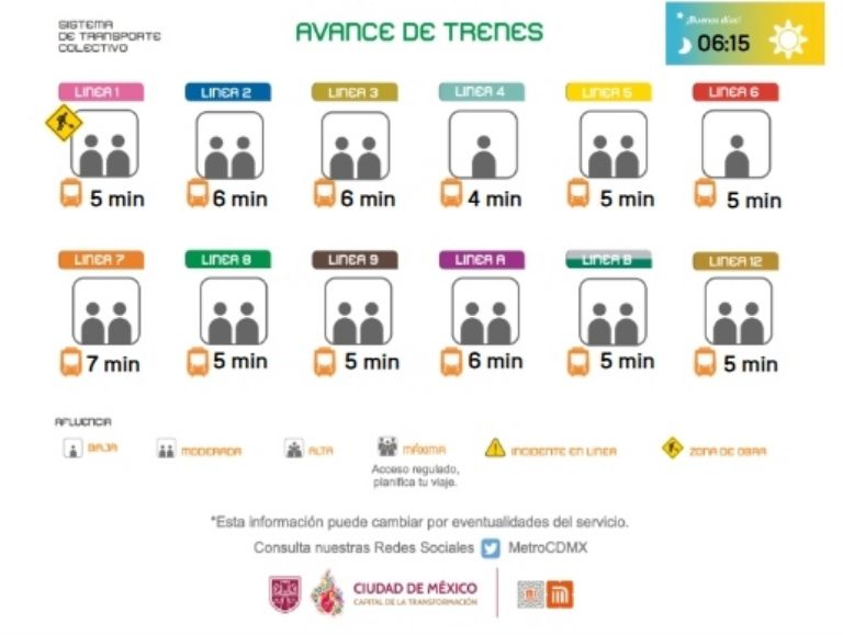 Se tiene que recordar que todos los usuarios del Sistema de Transporte Colectivo Metro deben mantenerse informado constantemente sobre los tiempos de espera, ya que los accidentes, lluvias y cualquier otra circunstancia puede alentar la llegada de los trenes a cada una de estaciones que integran el Metro.