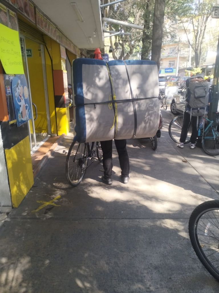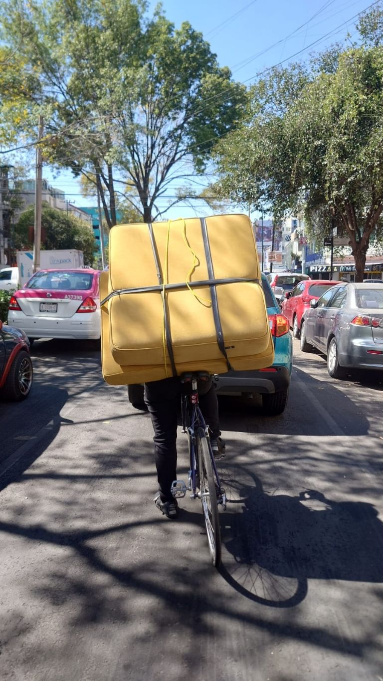 El sillón, los colchones y las mesas pudieron desarmarse o doblarse, por lo que bastó sujetarlos a la espalda de los más intrépidos, quienes los llevaron mientras pedaleaban. Entre bromas que recordaban a “El Pípila”, tuvieron que demostrar toda su habilidad para equilibrarse mientras se abrieron paso entre los carros, auxiliados de chiflidos y silbatazos para hacerse notar.