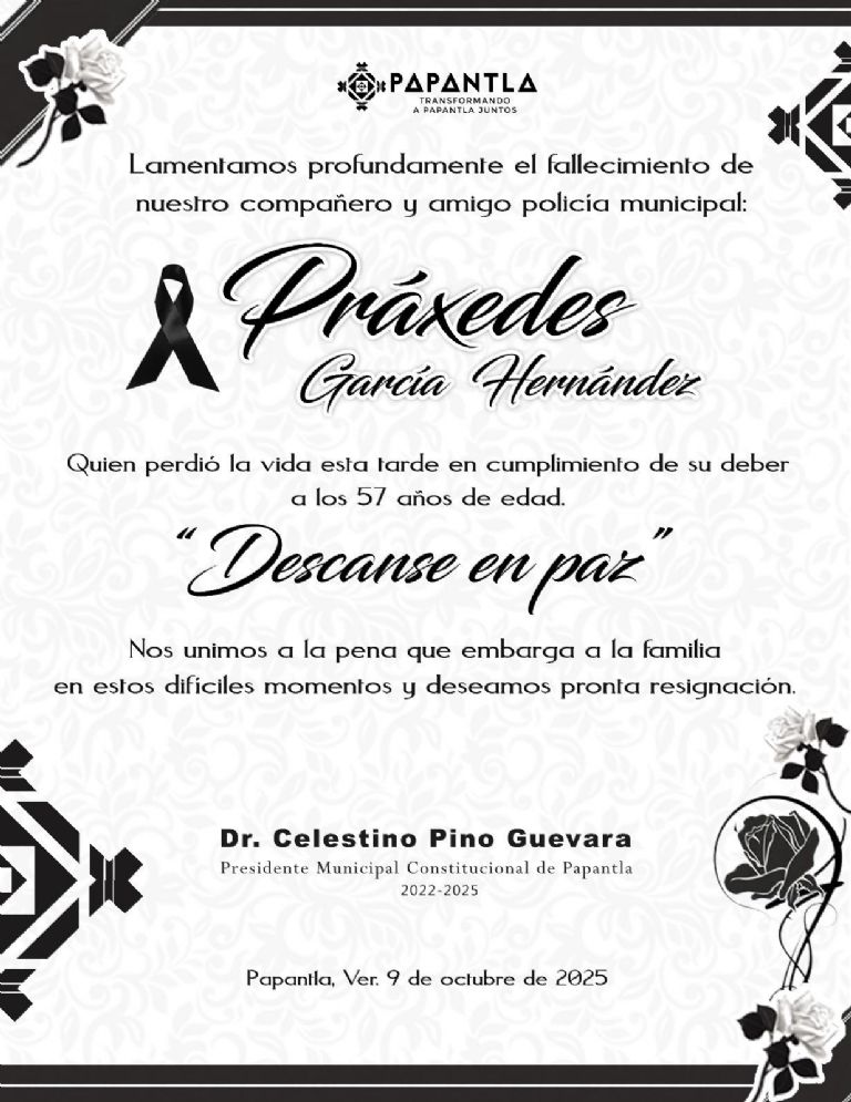 Mediante una esquela, se informó la pérdida de la vida de Práxedes, a quien se le reconoció como un gran elemento que ofrendó su vida en aras de salvar las de los demás.