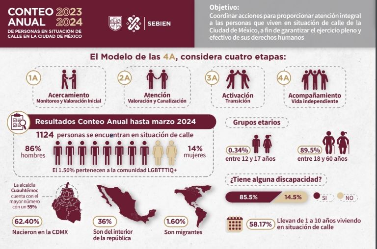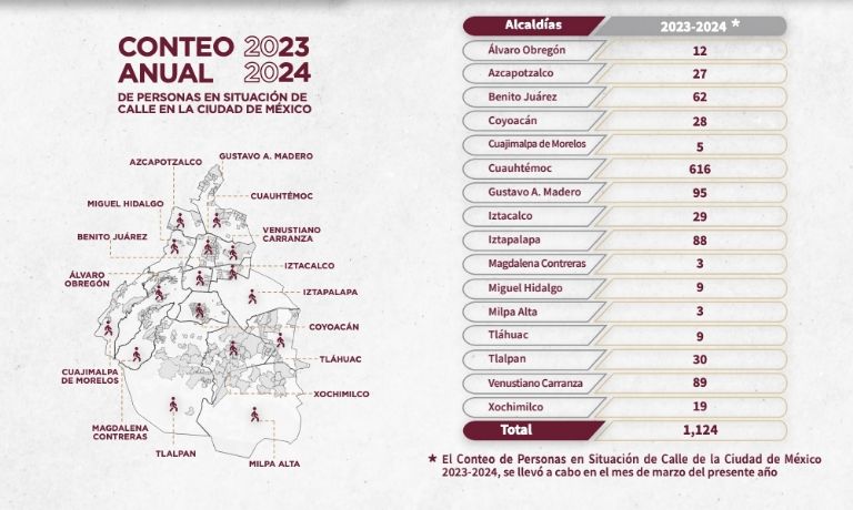 De acuerdo con cifras sociodemográficas de SEBIEN, durante marzo de 2024 se registraron mil 124 personas en situación de calle en la Ciudad de México, entre los cuales el 86 por ciento eran hombres y el 14 por ciento eran mujeres. Además, la alcaldía Cuauhtémoc fue la que registró el mayor número de individuos de este sector poblacional, con un total de 55 por ciento.