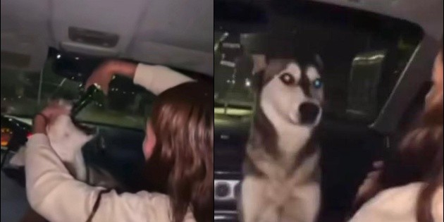 Además de dicha mujer, una persona graba los hechos desde el asiento trasero y presumiblemente ríe ante las reacciones del canino.