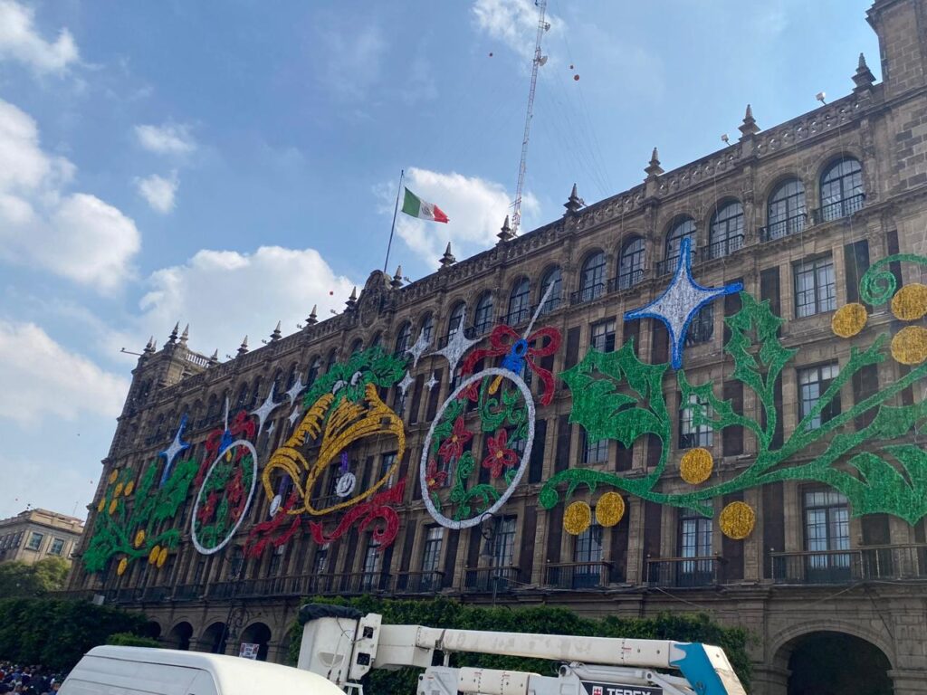 Mosaicos monumentales elaborados con focos led, escarcha, mallas, festón, manguera luminosa, varilla y alambrón ya lucen sobre la fachada de los edificios de gobierno que rodean al Zócalo capitalino.