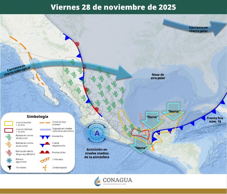 Con el pronóstico extendido a 96 horas del Servicio Meteorológico Nacional (SMN) de la Comisión Nacional del Agua (Conagua), se informó que el frente frío número 16 se desplazará sobre la vertiente del golfo de México, en interacción con un canal de baja presión en el sureste del territorio nacional, ocasionando chubascos y lluvias fuertes a muy fuertes en el noreste, oriente y sureste del país, con lluvias puntuales intensas en zonas de Hidalgo, Puebla, Veracruz y Oaxaca.