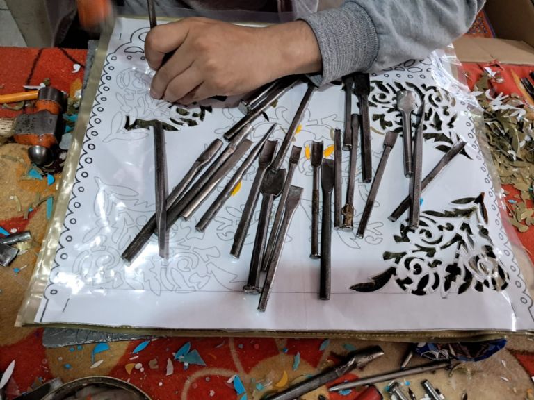 “Un trabajo artesanal que es de un pliego de 40×35 cm se ocupan alrededor de 130 cinceles y en 2020 empezaron con un diseño un poco más sencillo que no requiera de tanto cincel, ya más adelante conforme va pasando el tiempo se hace la compra de varios cinceles y se hace sobre la base de plomo y van calando con el cincel”, detalla María.