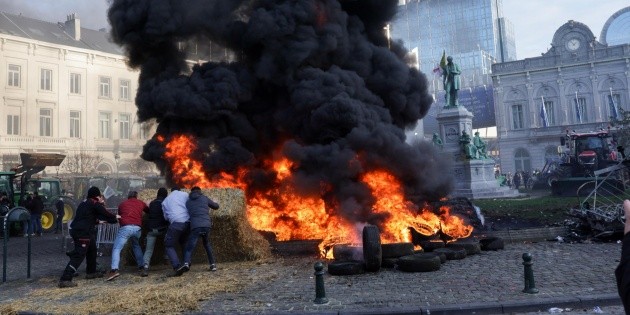 Los manifestantes, algunos con el rostro tapado, llegaron al epicentro del barrio europeo sobre las 14:00 hora local (13.00 GMT) con decenas de tractores y prendieron fuego a decenas de neumáticos en el centro de la plaza de Luxemburgo, frente a la Eurocámara, lo que provocó una gran columna de humo negro.