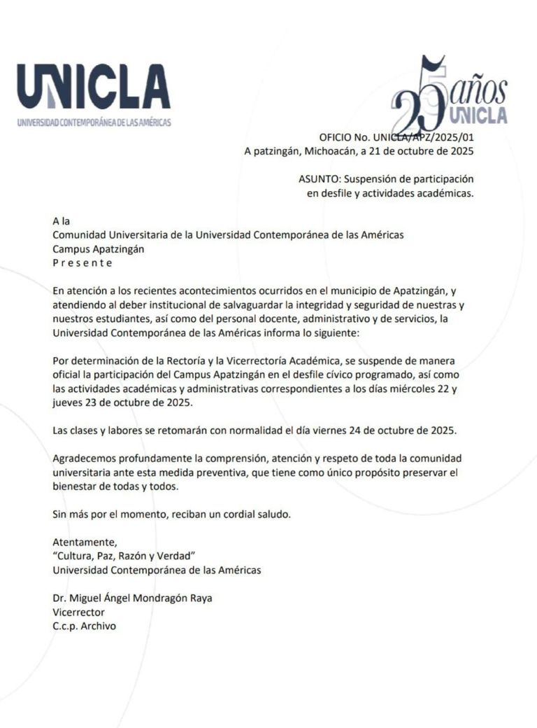 “Por determinación de la Rectoría y la Vicerrectoría Académica, se suspende de manera oficial la participación del Campus Apatzingán en el desfile cívico programado, así como las actividades académicas y administrativas correspondientes a los días miércoles 22 y jueves 23 de octubre de 2025”, refiere el desplegado.