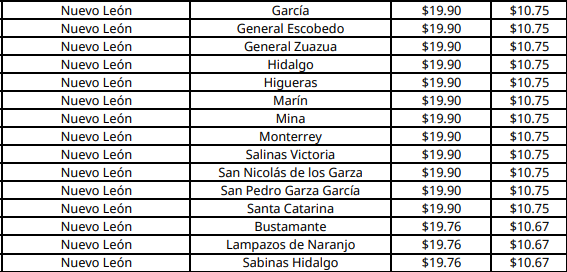 En el noreste del país, como en Monterrey, Nuevo León, el precio máximo aplicable del combustible, según la CNE, será de 19.90 pesos.
