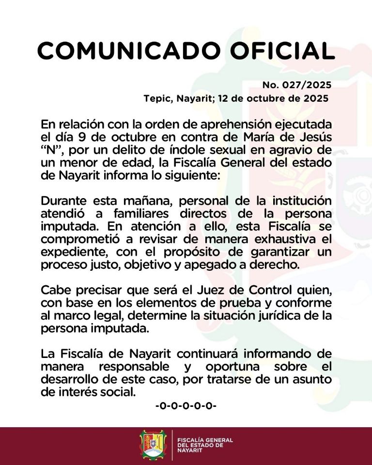 Por su parte, la Fiscalía del Estado de Nayarit informó en un comunicado que se revisará de manera exhaustiva el expediente, garantizando un proceso justo contra la señalada. El organismo destacó que el juez de control será el responsable de evaluar las evidencias y decidir si existen elementos suficientes para mantenerla privada de la libertad.