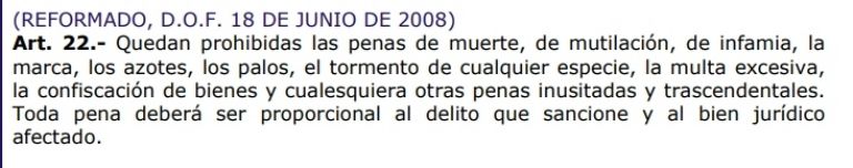 De acuerdo con el artículo 22 de la Constitución Política de los Estados Unidos Mexicanos, se prohíben las penas de muerte, mutilación e infamia contra una persona que haya cometido un crimen sin pasar por su debido proceso legal.