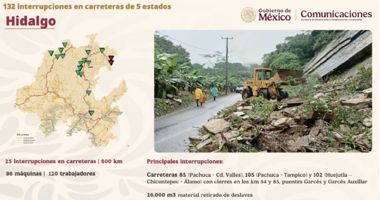 El Secretario de Comunicaciones, Infraestructura y Transporte, Jesús Esteva, detalló las afectaciones: Hidalgo, 25 interrupciones con 600 kilómetros afectados; Puebla, 20 en 71 kilómetros; Querétaro, 7 en 294 kilómetros; San Luis Potosí, 7 en un kilómetro; Veracruz, 73 interrupciones en 90 kilómetros.