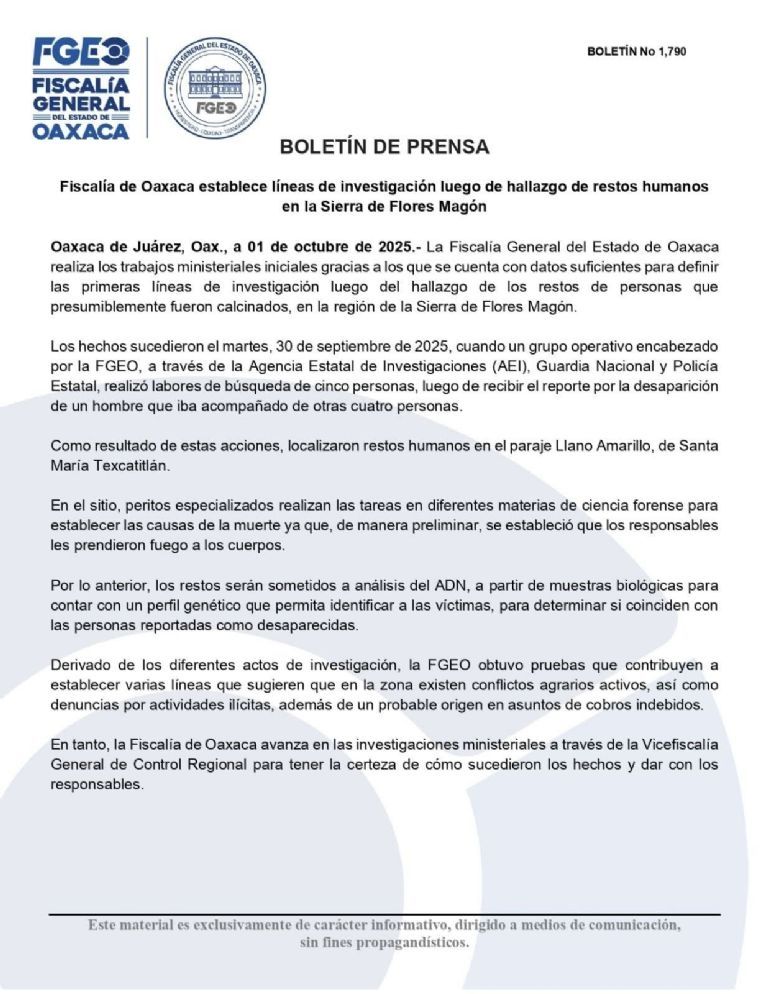 La fiscal de Oaxaca estableció tres líneas de investigación en el caso de las cinco personas, entre ellas una mujer, linchadas y calcinadas en la comunidad de Santa María Texcaltitlán en la Sierra de Flores Magón. Entre ellas los cobros ilegales “gota a gota”. El titular del organismo Bernardo Rodríguez Alamilla no descartó otras dos más entre ellas el robo y conflictos agrarios que prevalecen en esta zona, perteneciente al distrito de Cuicatlán.
