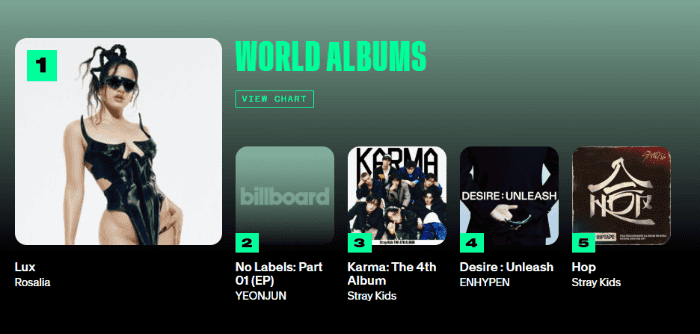 Por arriba de la cantante de ‘Malamente’ se encuentra en el puesto número 1 por sexta semana consecutiva ‘Life of a Showgirl’, de la estadounidense Taylor Swift; el número 2 lo ocupa ‘I’m the Problem’, de Morgan Wallen, mientras que el número 3 es para la banda sonora de la película surcoreana ‘KPop Demon Hunters’.
