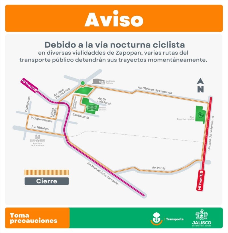 A partir de las 9:00 pm, las siguientes rutas se detendrán al paso de las y los participantes de la Vía Nocturna Zapopan Navideña: