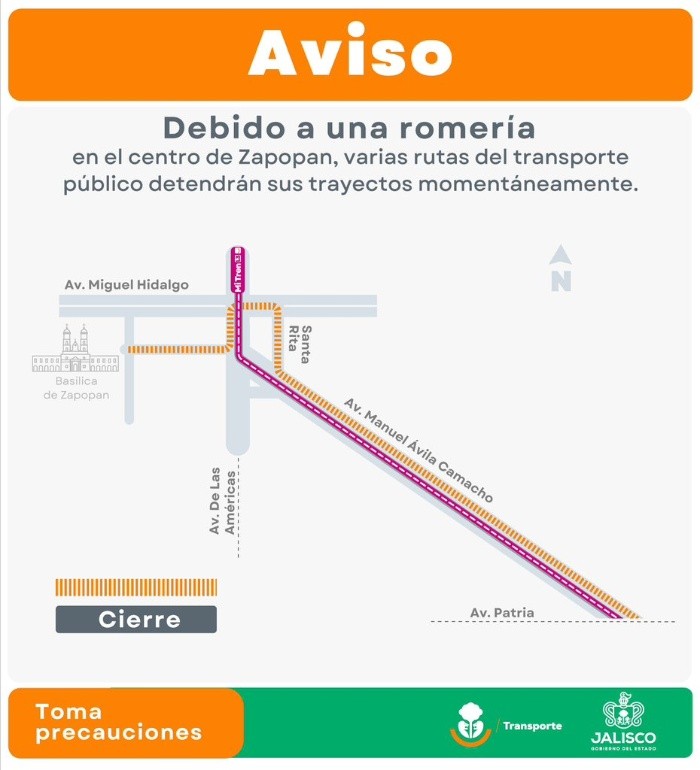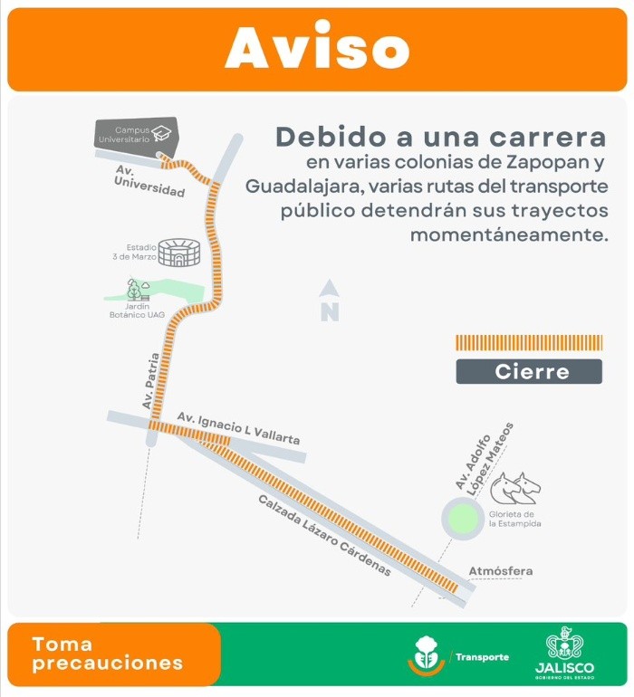 La Secretaría de Transporte Jalisco informó que el próximo domingo 9 de noviembre, algunas rutas de camiones pararán en la Zona Metropolitana de Guadalajara (ZMG), debido a dos carreras deportivas que se realizarán a las 6:30 am y  por la Mini Romería 2025 con horario previsto a las 8:00 de la mañana.