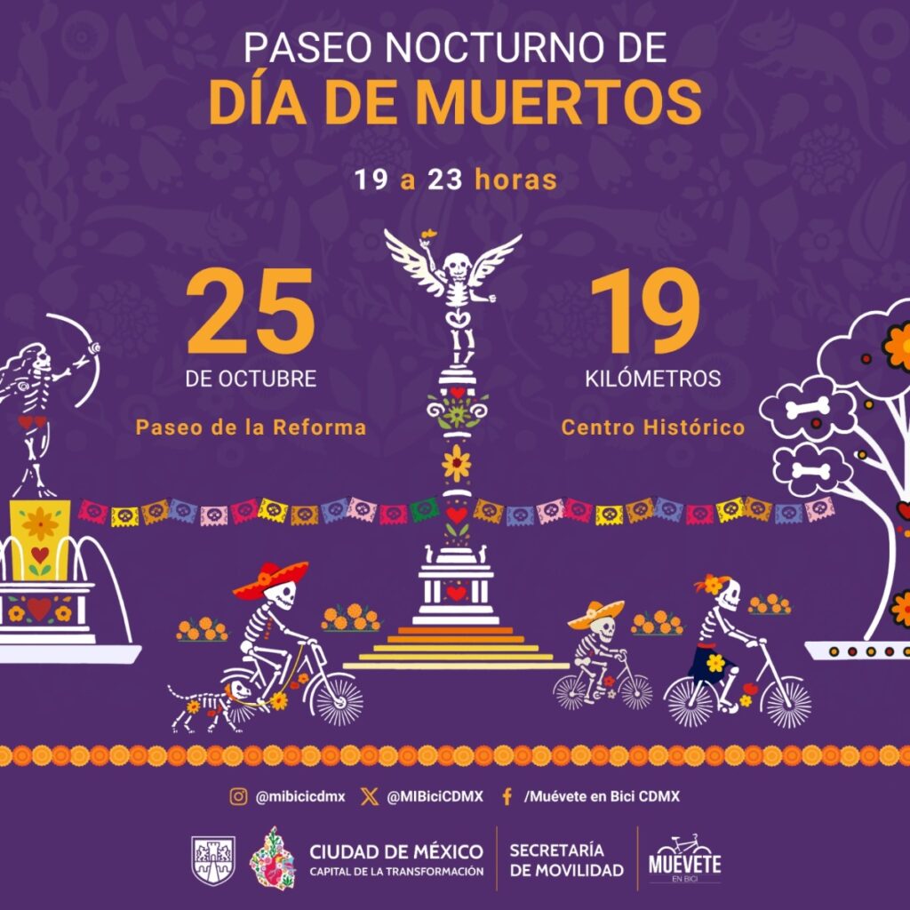 La Secretaría de Movilidad invita a ciclistas, patinadores, corredores y peatones para unirse al Paseo Nocturno “Muévete en Bici”. Esta actividad se enmarca en las festividades organizadas por el Gobierno de la Ciudad de México para celebrar el Día de Muertos, una de las tradiciones mexicanas favoritas que tiene lugar el 1 de noviembre.