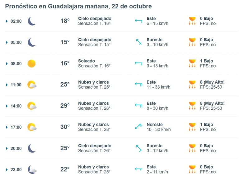 - 8:00 am: el cielo estará despejado y soleado con 16°C, perfecto para comenzar el día. El viento será suave y no habrá riesgo por el sol todavía.