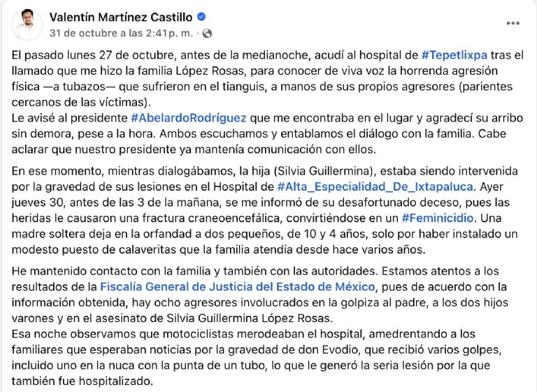 “Estamos atentos a los resultados de la Fiscalía General de Justicia del Estado de México, pues de acuerdo con la información obtenida, hay ocho agresores involucrados en la golpiza al padre, a los dos hijos varones y en el asesinato de Silvia Guillermina López Rosas”, escribió el diputado Martínez Castillo en su cuenta oficial de Facebook, en la que condenó la agresión.