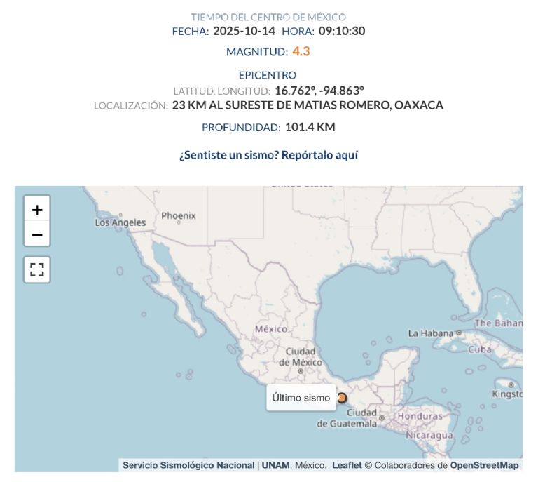 Hora: 09:10 am. Epicentro: sureste de Matías Romero, Oaxaca, con coordenadas de 16.762°, -94.863°, una profundidad de kilómetros. Magnitud de 4.3.