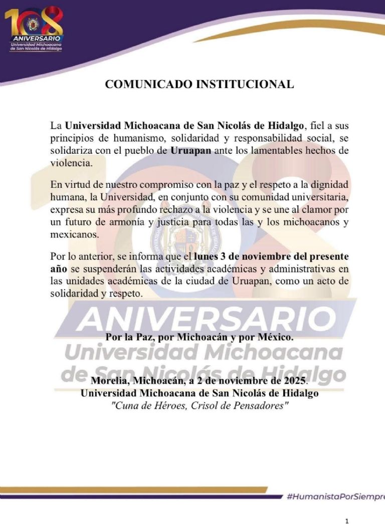 “Se informa que el lunes 3 de noviembre del presente año se suspenderán las actividades académicas y administrativas en las unidades académicas de la ciudad de Uruapan, como un acto de solidaridad y respeto”, detalló la UMSNH en conjunto con la comunidad universitaria.