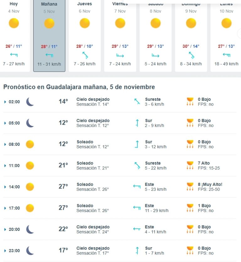 El miercoles 5 de noviembre en Guadalajara será un día soleado y caluroso en la tarde, con madrugada y noche frescas, sin lluvias y vientos suaves. Ideal para actividades al aire libre, siempre usando bloqueador solar entre las 11:00 a.m. y 2:00 p.m., que es cuando el sol estará más fuerte