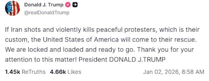 “Si Irán dispara y mata violentamente a los manifestantes pacíficos, que es su costumbre, los Estados Unidos de América acudirán en su rescate”, ha advertido Trump en su red social personal, Truth. “Estamos listos, cargados y preparados para salir”, ha concluido.