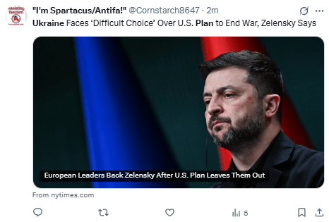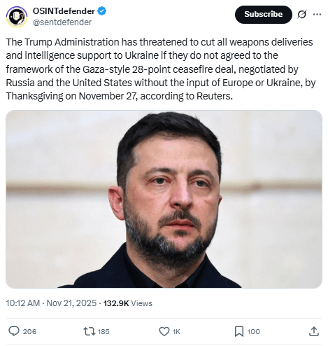 Regeneración, 21 de noviembre 2025– Un nuevo plan de la administración Trump para poner fin a la guerra en Ucrania contempla que Kiev ceda territorio a Rusia, y el reconocimiento “de facto” por parte de Estados Unidos de Crimea y otros territorios tomados por la fuerza por el Kremlin como rusos.