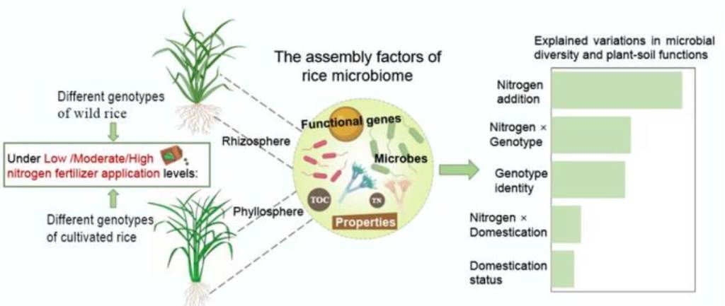 El equipo realizó un experimento en invernadero con siete genotipos de arroz: tres variedades cultivadas ampliamente y cuatro parientes silvestres. Estas plantas se cultivaron bajo tres niveles distintos de fertilización nitrogenada (bajo, medio y alto), un factor clave en la producción agrícola moderna. Lo que observaron fue contundente: las diferencias entre genotipos explicaban más variación en los microbiomas que el hecho de que las plantas fueran silvestres o domesticadas.