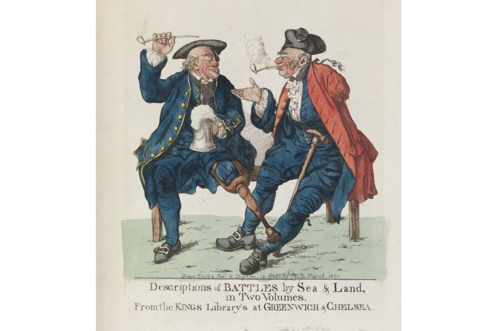 Una ilustración satírica muestra a dos veteranos ancianos sentados en un banco, compartiendo tabaco entre risas y gestos exagerados, como si animaran una conversación llena de recuerdos y anécdotas. Fuente: Lewis Walpole Library