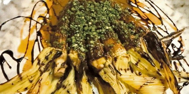 Iniciamos con unos buenos elotitos bebé ($230); es una botanita muy sencilla de elotes baby, que cabe mencionar, no son de lata y vienen con sus hojas, que pasan por el grill hasta dejarlos muy tiernos, en su punto. Pincelan con una mayonesa de miso, que es esta pasta de soya fermentada, un poco de soya y unas líneas de reducción de balsámico que le da un toque dulce al platillo. Vienen como 6 piezas, es una excelente entrada o botana, como ellos lo denominan.