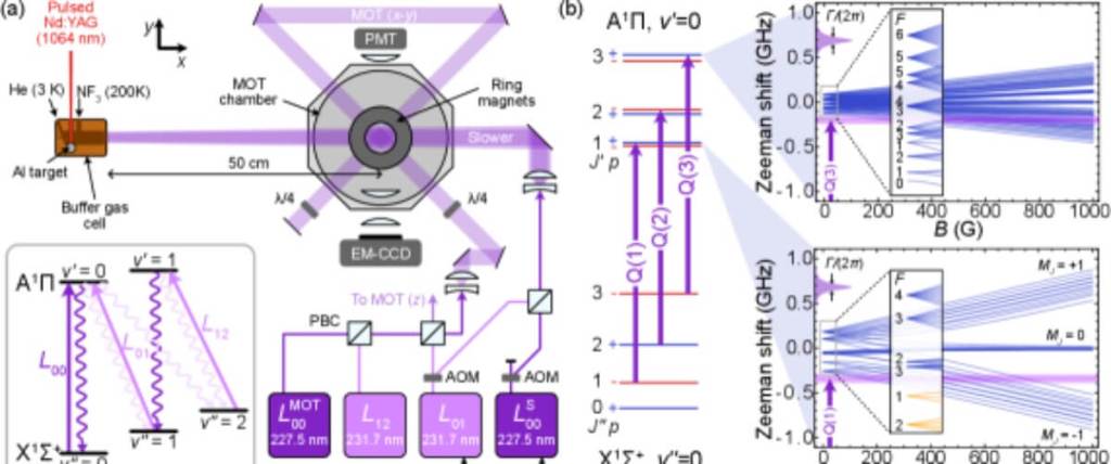 Las moléculas de fluoruro de aluminio se generaron a partir de una reacción entre un blanco sólido de aluminio y gas trifluoruro de nitrógeno. Una vez formadas, eran dirigidas hacia una celda de vacío donde los láseres se encargaban de ralentizarlas y capturarlas. En este proceso, se alcanzaron velocidades de tan solo unos pocos metros por segundo y temperaturas de aproximadamente 14 a 16 milikelvin, es decir, a solo unas milésimas de grado por encima del cero absoluto.