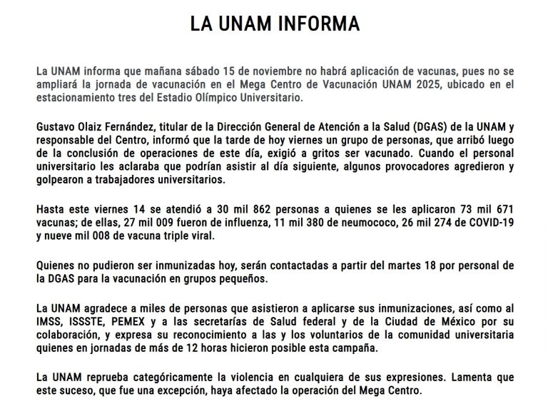 No obstante, violencia cometida contra el personal universitario, quien presuntamente se limitó a informar sobre el calendario de vacunación, ocasionó que la UNAM cancelara la ampliación de la jornada de vacunación para este 15 de noviembre. Sin embargo, las personas rezagadas que no alcanzaron su vacuna ayer serán contactadas por la DGAS a partir del próximo martes, 18 de noviembre para citarlos en grupos pequeños.