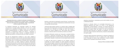 En su comunicado, Venezuela asegura repudiar con “absoluta contundencia” el intento de Estados Unidos de aplicar “extraterritorialmente la ilegítima jurisdicción de EE UU en Venezuela”, al pretender “dar órdenes y amenazar” la soberanía de su espacio aéreo, la integridad territorial y la seguridad aeronáutica.