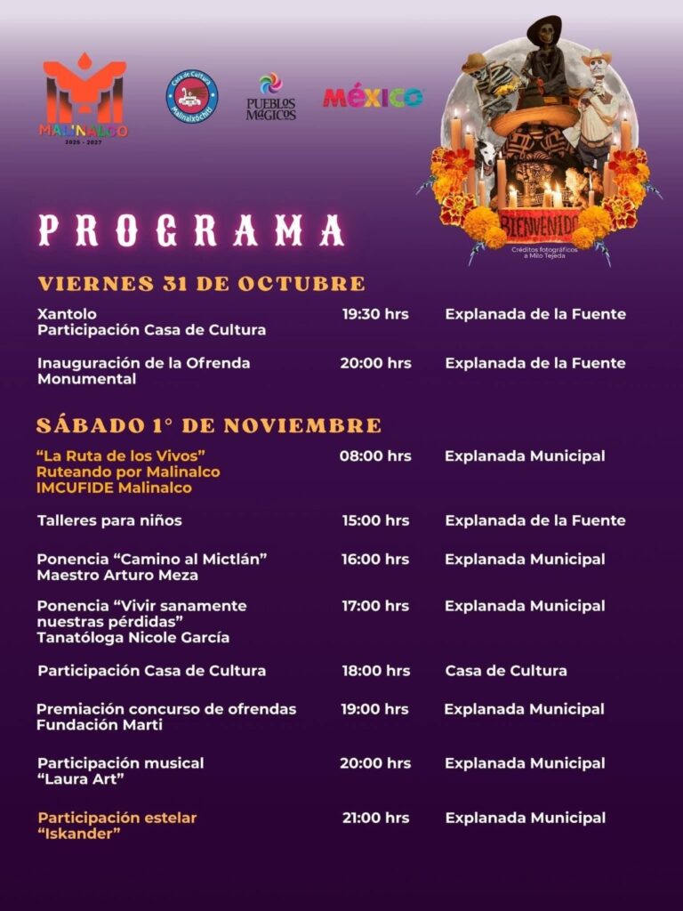 El Festival de Día de Muertos en Malinalco dará inicio con una presentación de Xantolo a cargo de la Casa de la Cultura, que se llevará a cabo en la explanada de la fuente del Pueblo Mágico a las 19:30 horas. Posteriormente, a las 20:00 horas, se inaugurará la Ofrenda Monumental del Festival Cultural “Entre Altares y Ofrendas” Malinalco 2025.